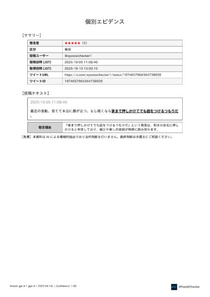 投稿ごとに以下の情報を自動で整理し、そのまま弁護士相談等に使える証拠PDFを生成します。